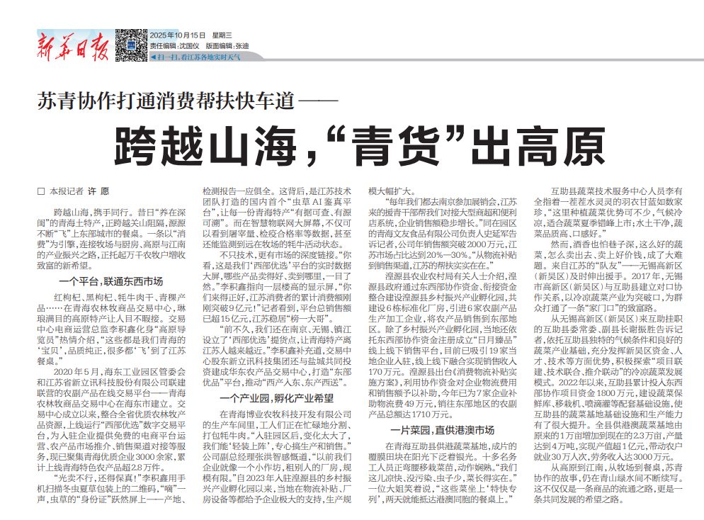 “前不久,我們還在南京、無(wú)錫、鎮(zhèn)江設(shè)立了‘西部?jī)?yōu)選’提貨點(diǎn),讓青海特產(chǎn)離江蘇人越來(lái)越近。”李積鑫補(bǔ)充道,交易中心股東新立訊科技集團(tuán)還與鹽城共同投資建成華東農(nóng)產(chǎn)品交易中心,打造“東部?jī)?yōu)品”平臺(tái),推動(dòng)“西產(chǎn)入東、東產(chǎn)西送”。