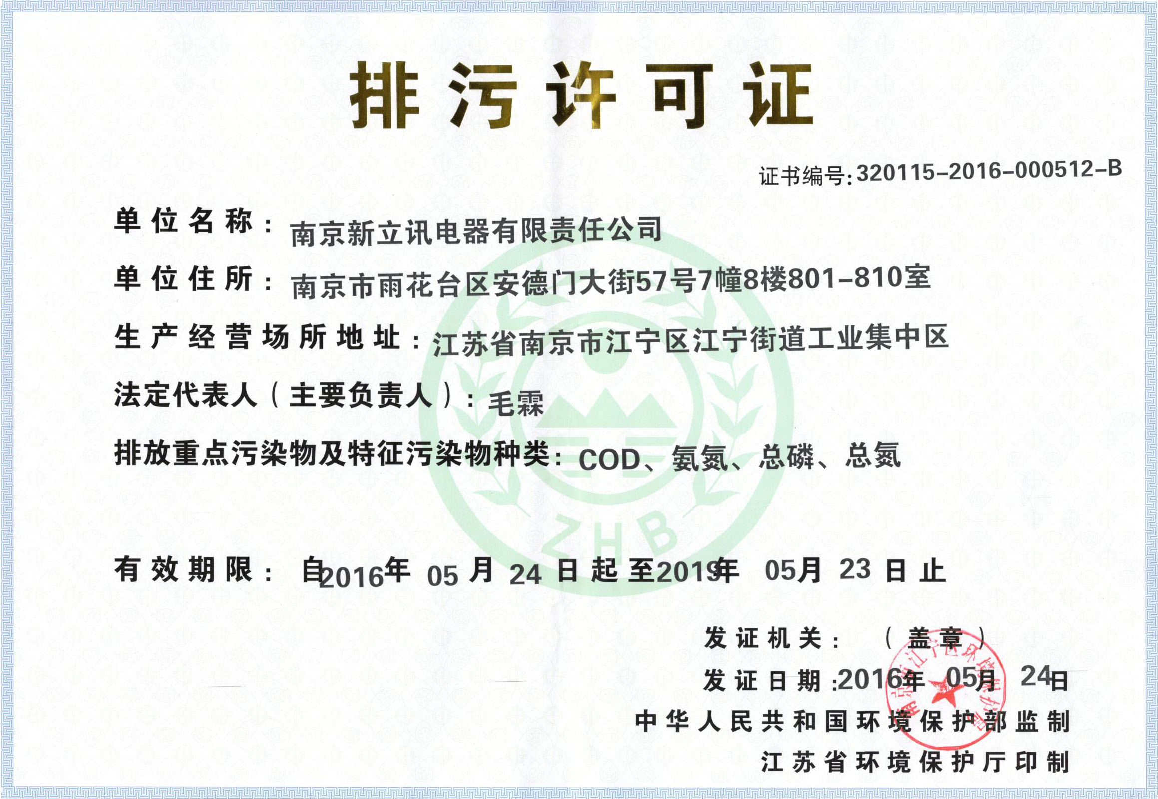 2016年5月24日,南京新立訊電器有限責任公司獲得江蘇省環境保護廳頒發的最新版排污許可證。南京新立訊電器有限責任公司成立以來,領導班子高度重視環境保護工作,多次就環保驗收及排污許可證的取得等事宜進行安排部署,極大地促進此項工作的完成。