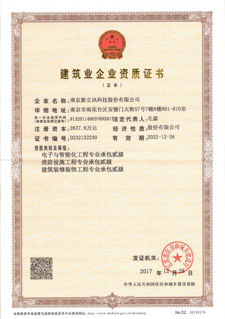 2017年12月,南京新立訊科技股份有限公司獲由江蘇省住房和城鄉建設廳頒發的《建筑業企業資質證書》,包含“電子與智能化工程專業承包”、“消防設施工程專業承包”及“建筑裝修裝飾工程專業承包”三項資質,證書編號:D232122230,證書有效期:2022年12月26日。