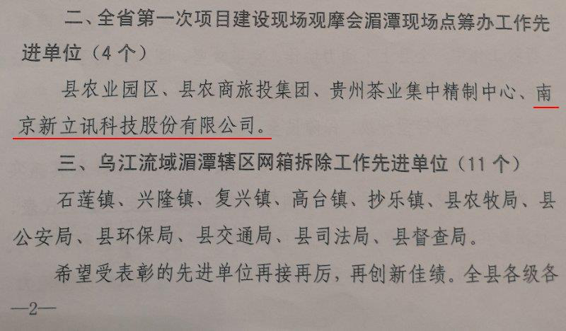 2018年5月16日,貴州省湄潭縣委、縣人民政府對(duì)南京新立訊科技股份有限公司在2018貴州茶“一節(jié)一會(huì)”籌備、貴州省全省第一次扶貧項(xiàng)目建設(shè)現(xiàn)場觀摩會(huì)湄潭現(xiàn)場點(diǎn)籌辦等工作中的優(yōu)秀表現(xiàn)及突出貢獻(xiàn)進(jìn)行通報(bào)表揚(yáng)。