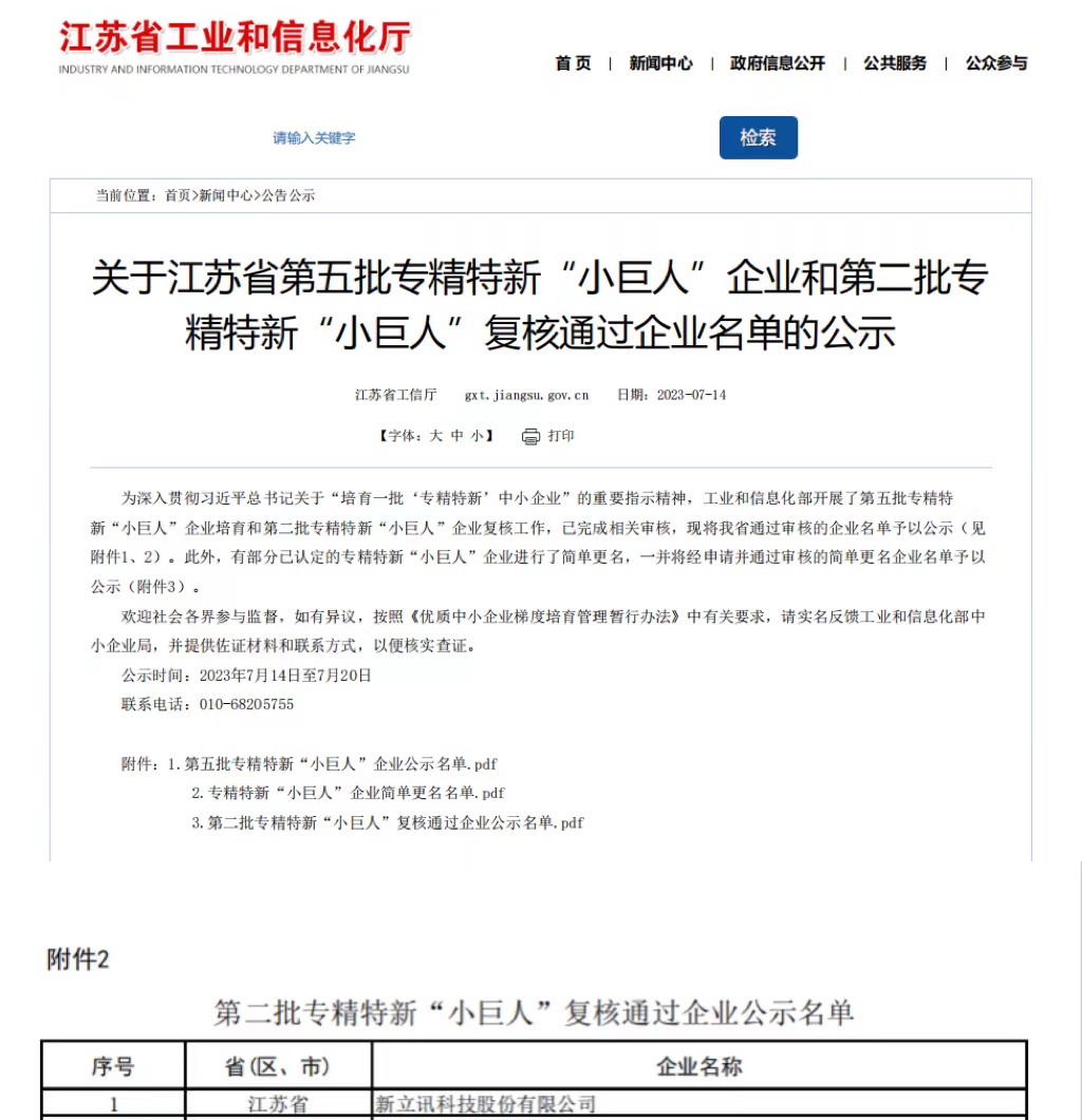 2023年7月20日,新立訊科技股份有限公司“第二批全國專精特新小巨人企業(yè)”復(fù)核通過,江蘇工信發(fā)布。